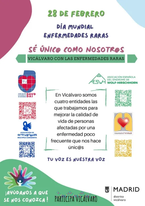 Este año nos hemos unido, gracias a Participa Vicálvaro, a otras 3 asociaciones de enfermedades raras que hay en el distrito (AMC -Artrogriposis Múltiple Congénita – España, Asociación Española del Síndrome de Wolf-Hirschhorn y DAVD-Asociación Española de Enfermos con Displasia Arritmogénica Del Ventrículo Derecho) para unir fuerzas y dar mayor visibilidad a las personas con enfermedades poco frecuentes.