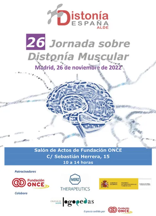 El próximo sábado 26 de noviembre la asociación Distonía España - ALDE organiza la XXVI Jornada sobre Distonía Muscular en la sede de la Fundación ONCE en Madrid, C/ Sebastián Herrera, 15, en horario de 10 a 14 horas, una actividad de divulgación científica y social que reúne cada año a los pacientes y sus familias con los profesionales de la ciencia, la rehabilitación neurológica y la atención psicosociosanitaria.
