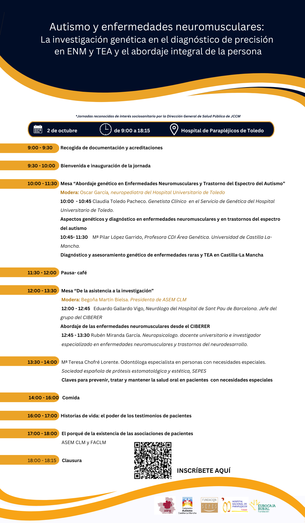 La Asociación de Enfermedades Neuromusculares de Castilla-La Mancha (ASEM CLM) y la Federación de Autismo Castilla-La Mancha (FACLM) , se complacen en informarles sobre la jornada científica "Autismo y enfermedades neuromusculares: La investigación genética en el diagnóstico de precisión en ENM y TEA y el abordaje integral de la persona"