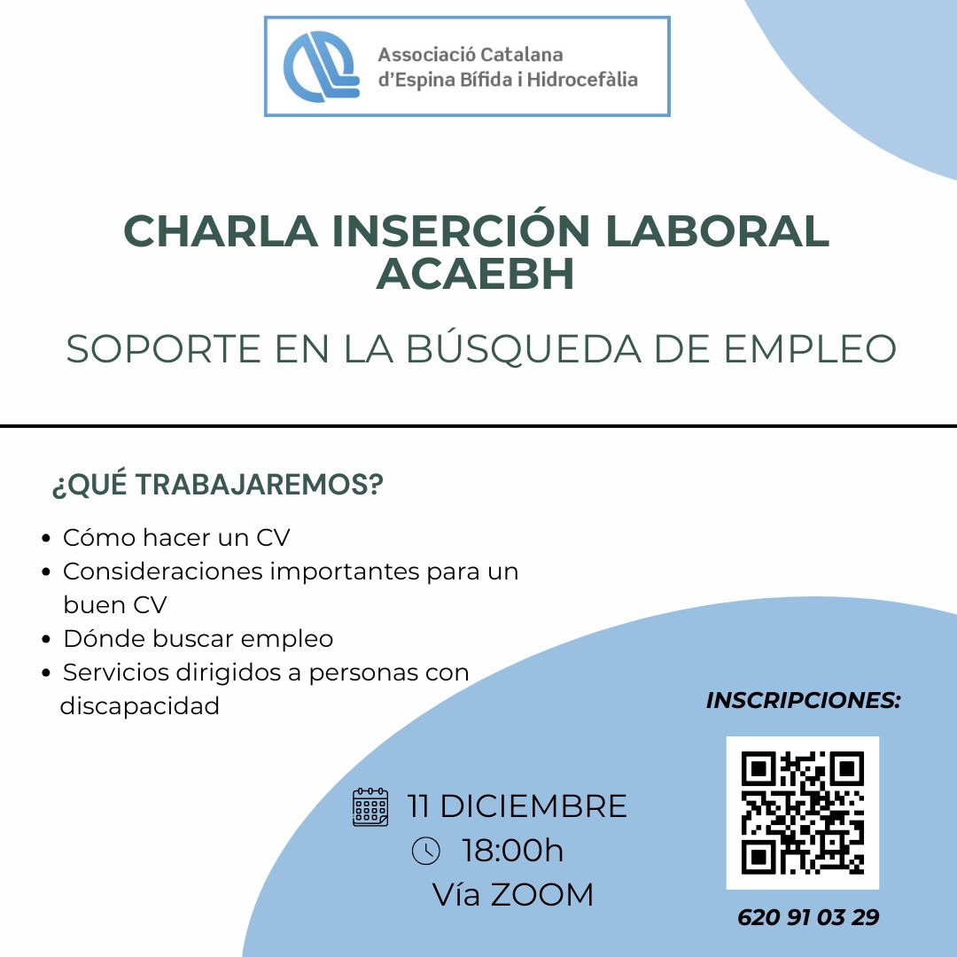 Desde ACAEBH realizaremos una charla online de inserción laboral para dar soporte a la búsqueda de empleo. Será de 18:00h a 18:30h aproximadamente y se necesita inscripción previa. Totalmente gratuita.