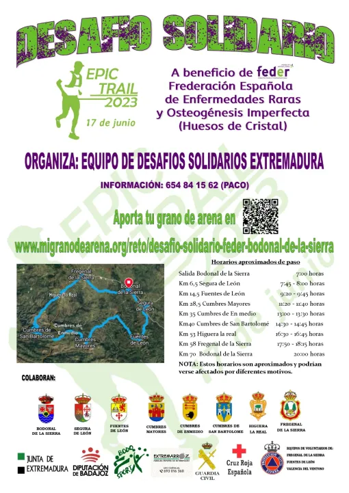 El próximo 17 de julio y tras el gran éxito de las anteriores ediciones, Bodonal de la Sierra vuelve a convertirse en la línea de salida del desafío solidario Epic Trail, que en esta edición de 2023, recorrerá 8 localidades y 70 km en favor de las personas con enfermedades poco frecuentes y sus familias.