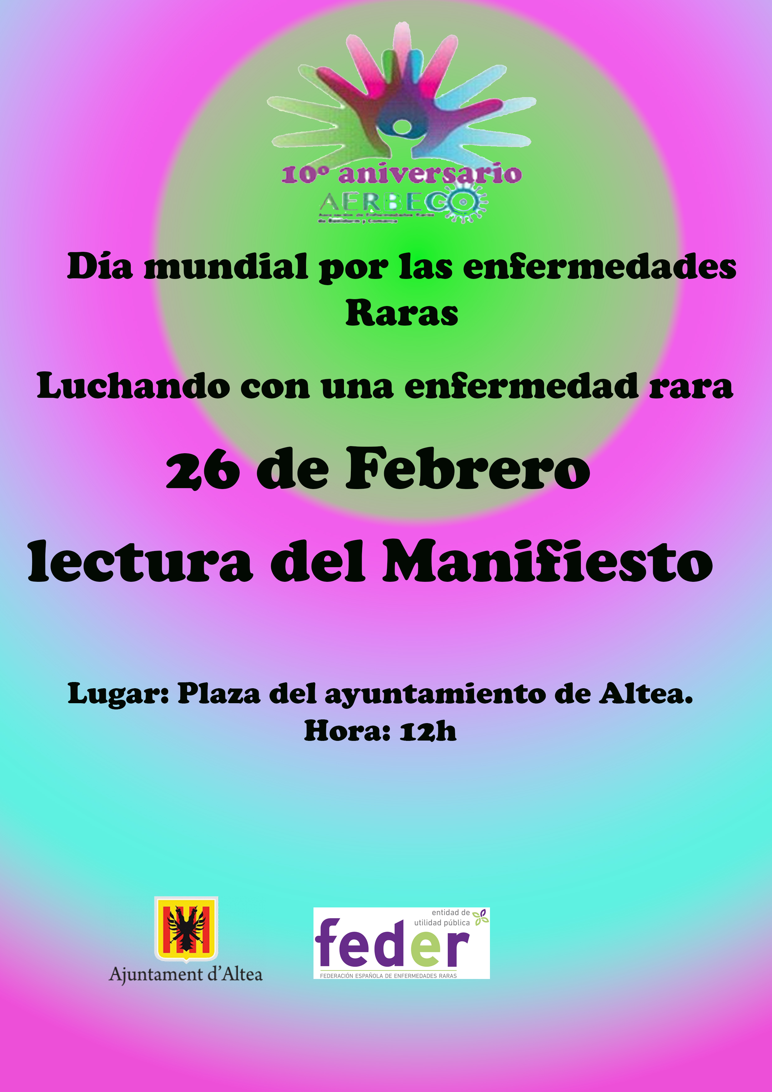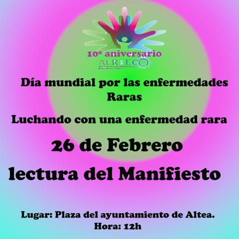 El siguiente acto será el día 26 de febrero a las 12h. Con la lectura del manifiesto por el día mundial de las enfermedades raras en la plaza del ayuntamiento de Altea.