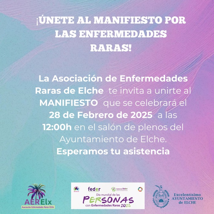 La Asociación de Enfermedades Raras de Elche te invita a unirte al MANIFIESTO que se celebrará el 28 de Febrero de 2025 a las 12:00h en el salón de plenos del Ayuntamiento de Elche. Esperamos tu asistencia.