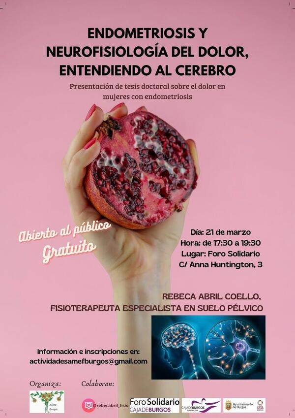 Compartir en:Desde AMEF Burgos, con motivo del Día Internacional de la Endometriosis van a realizar en el mes de marzo una ponencia, el próximo 21 de marzo, de la mano de Rebeca Abril Coello: "Endometriosis y Neurofisiología del dolor, entendiendo al cerebro" (Presentación de Tesis Doctoral sobre el Dolor en mujeres con Endometriosis). Rebeca Abril Coello es fisioterapeuta especializada en suelo pélvico