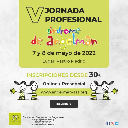 La Asociación del Síndrome de Angelman celebra los próximo 7 y 8 de mayo en Madrid las V Jornadas de Profesionales sobre el Síndrome de Angelman, unas jornadas a las que se podrá acudir tanto de manera presencial como online, realizando una inscripción desde 30 €.