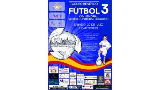 El sábado 20 de julio tendrá lugar una nueva edición del torneo benéfico de fútbol 3. Se trata del XXIV memorial Víctor Contreras Cogorro, en el que se podrá competir en ocho categorías: mini-chupetines, chupetines, pre-benjamín, benjamín, alevín, infantil, veteranos y femenino.