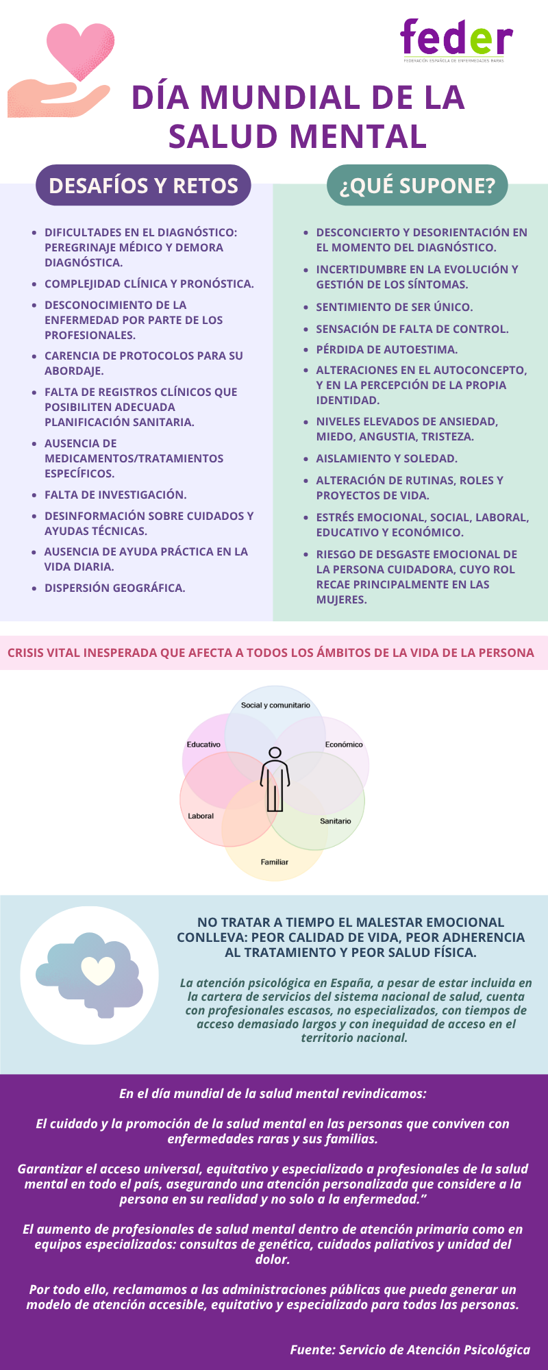 En el marco del día mundial de la salud mental, 10 de octubre, la Federación Española de Enfermedades Raras (FEDER) pone de relieve una realidad muchas veces invisibles, el enorme impacto emocional que supone convivir con una enfermedad rara o en búsqueda de diagnóstico.