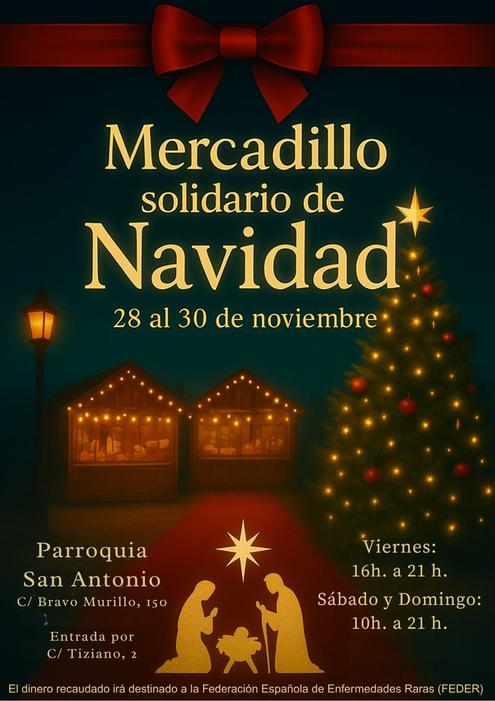 La Parroquia de San Antonio, situada en la calle Bravo Murillo 150 de Madrid, celebrará los días 28, 29 y 30 de noviembre su tradicional Mercadillo Solidario de Navidad, destinando la recaudación a la Federación Española de Enfermedades Raras (FEDER) para acompañar a las más de 3 millones de personas que conviven con una enfermedad rara y a quienes aún están en búsqueda de diagnóstico en nuestro país.