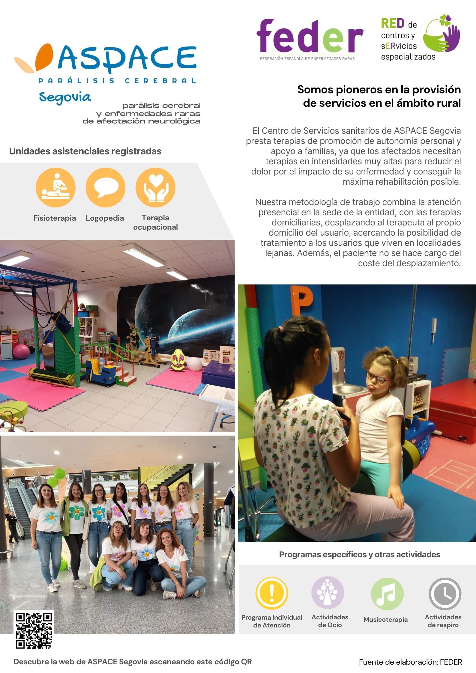 El Centro de Servicios sanitarios de ASPACE Segovia presta terapias de promoción de autonomía personal y apoyo a familias, ya que los afectados necesitan terapias en intensidades muy altas para reducir el dolor por el impacto de su enfermedad y conseguir la máxima rehabilitación posible.