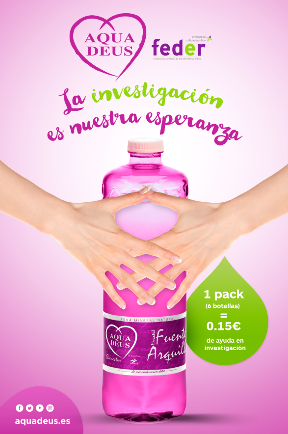 La empresa de agua mineral natural Aquadeus lanza con motivo del Día Mundial de las Enfermedades Raras una ilusionante campaña solidaria a favor de FEDER. Con el objetivo de colaborar en la investigación de las enfermedades poco frecuentes, Aquadeus ha diseñado una botella solidaria con el lema de nuestra campaña de sensibilización: 'La investigación es nuestra esperanza'.