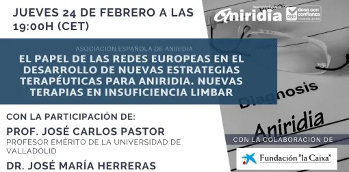 Fuente Asociación Española de Aniridia | El jueves 24 de febrero a las 19:00 h, en conmemoración por el Día Mundial de las Enfermedades Raras (28 de febrero), tendremos con nosotros al Prof. Pastor y al Dr. Herreras para hablarnos del papel de las Redes Europeas de Referencia, la inclusión del Hospital de Valladolid en ERN-EYE y de nuevas terapias asociadas a la insuficiencia lumbar.