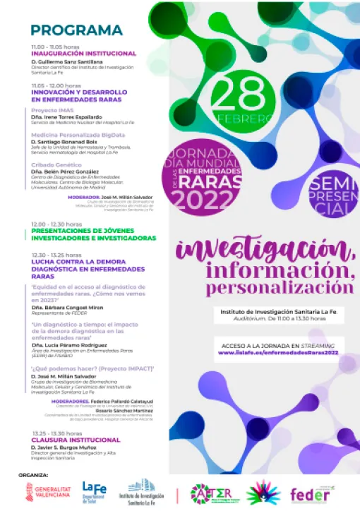 La jornada del Día Mundial de la Enfermedades Raras, está promovida por la Alianza en investigación Traslacional de Enfermedades Raras de la Comunidad Valenciana y FEDER, con ocasión del día mundial de las Enfermedades Raras, va dirigida tanto a pacientes y familiares, como a profesionales sanitarios y personal investigador.