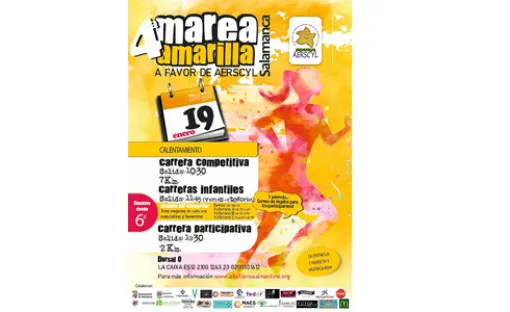 Fuente:AERSCYL La Asociación de Enfermedades Raras de Castilla y León (AERSCYL) lanza su IV edición de la Marea Amarilla, una carrera que se incluye dentro del Circuito Provincial de Carreras Populares de la Diputación de Salamanca. La <b>presentación</b> de este evento será este domingo día <b>12 de Enero</b> de 2020 a las 12:00 de la mañana, tendrá lugar en la sede de la Asociación que se encuentra situada en la calle Fray Junípero Serra, 11 (Salamanca)</p><p>