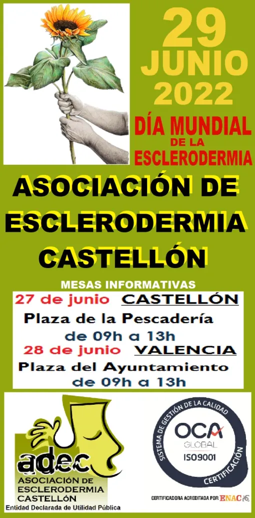 Nota de prensa. Fuente: Asociación de Esclerodermia Castellón (ADEC) | Tener una enfermedad de la que nadie ha oído hablar es una experiencia solitaria. Cuando incluso los médicos no son capaces de identificarla, o decirle al paciente lo que le va a pasar, la vivencia se hace más solitaria. El día de la concienciación de la Esclerodermia fue creado para transmitir a todo el mundo, incluyendo la comunidad médica, lo que significa padecer esta enfermedad discapacitante.
