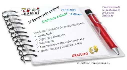 La Asociación Española de Familiares y Afectados por Síndrome de Kabuki (AEFA Kabuki) celebra el próximo 29 de octubre su 2º Seminario online pocos días después de celebrar su Dia Internacional con actividades de sensibilización y divulgación para dar a conocer esta enfermedad poco frecuente. La cita, contará con la participación de especialistas en cardiología, digestivo y nutrición, fisioterapia, estimulación y atención temprana así como dismorfología y genética clínica.