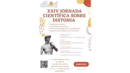 La Asociación de Lucha contra la distonía de Aragón (ALDA) presenta este 23 de noviembre la XXIV Jornada científica sobre Distonía en el salón de actos Antonio Millastre del H.C.U. Lozano Blesa (Zaragoza).