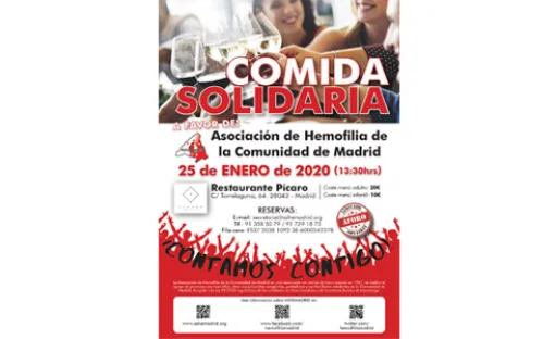 Fuente: Ashemadrid El sábado 25 de Enero se celebra la tradicional comida solidaria de la Asociación de Hemofilia de la Comunidad de Madrid (Ashemadrid). Será a la 13:30 en el Restaurante Pícaro situado en la Calle Torrelaguna, 64 (Madrid)</p><p>