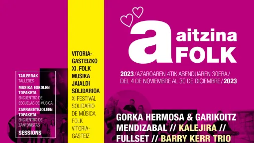 Fuente: Korrontzi | La XI edición del Festival Solidario Aitzina Folk llega cargada de novedades, con más de 20 conciertos y actividades para todos los públicos, con las actuaciones de grupos emergentes y consolidados, actividades para niños, siete talleres formativos y mucho más. El festival, cuya programación se presentará al público el 4 de noviembre a las 19:00 hrs en la Catedral de Santa María de Vitoria-Gasteiz, está organizado por el grupo de trabajo Aitzina Lan Taldea, creado en 2010 para apoyar a los afectados con ataxia telangiectasia y sus familias desde una perspectiva local en el País Vasco, e integrado en la organización estatal Aefat.