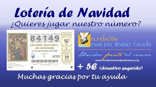 La Fundación, cuyo lema es "Unidos frente al Cáncer", te invita a jugar estas Navidades con su número 84149 por un precio de 20 euros. También instan a realizar un donativo adicional de 5 euros que irán destinados a continuar con la labor que desde 2013 lleva a cabo esta entidad.
