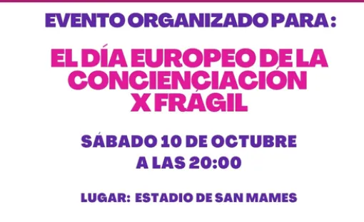 La Asociación de Síndrome X Frágil de País Vasco, con motivo del Día Europeo de la Concienciación X Frágil que se celebra el 10 de octubre, organiza una iluminación ese mismo día la ilumiinación del Estadio de San Mames, además realizarán una X humana solidaria para fomentar la visibilización de este síndrome</p><p>