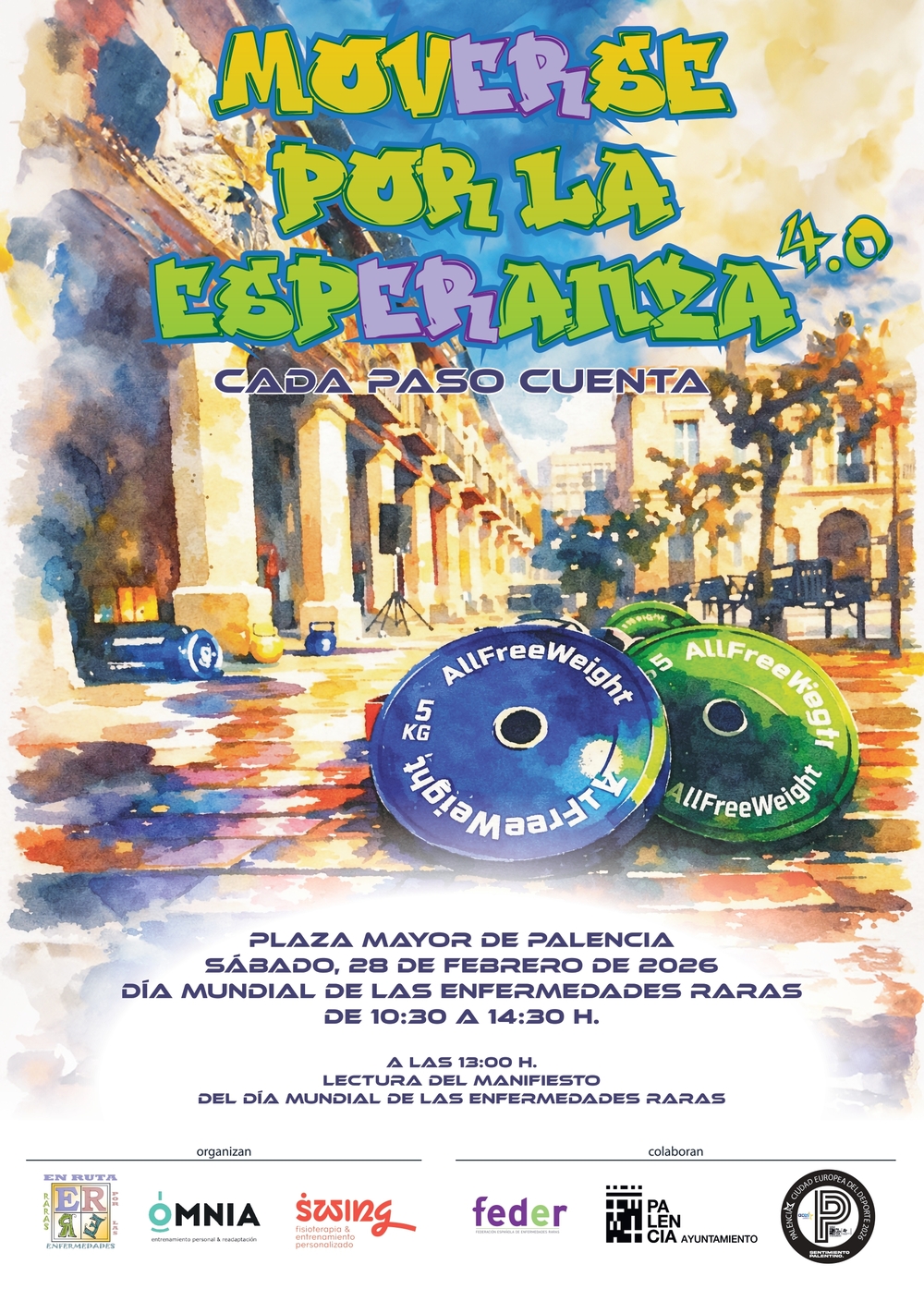 Organizada por ‘En Ruta por las Enfermedades Raras’, Omnia Centro de Entrenamiento Personal y Readaptación y Swing Fisioterapia y Rehabilitación, la actividad cuenta con la colaboración de la Federación Española de Enfermedades Raras (FEDER) y el Ayuntamiento de Palencia. De esta manera, entre todos se volverá a llenar la plaza de movimiento, empatía y compromiso. Los participantes podrán sumar kilómetros solidarios en un circuito de cardio y fuerza, repartido por el lateral izquierdo de la Plaza Mayor, supervisado por profesionales. Al concluir, cada persona recibirá un diploma acreditativo y participará en los sorteos finales. A las 13:00 horas se celebrará la lectura del Manifiesto del Día Mundial de las Enfermedades Raras, elaborado por FEDER, con la participación de autoridades y entidades locales. Gracias a este evento, En Ruta por las Enfermedades Raras acercará a los palentinos la