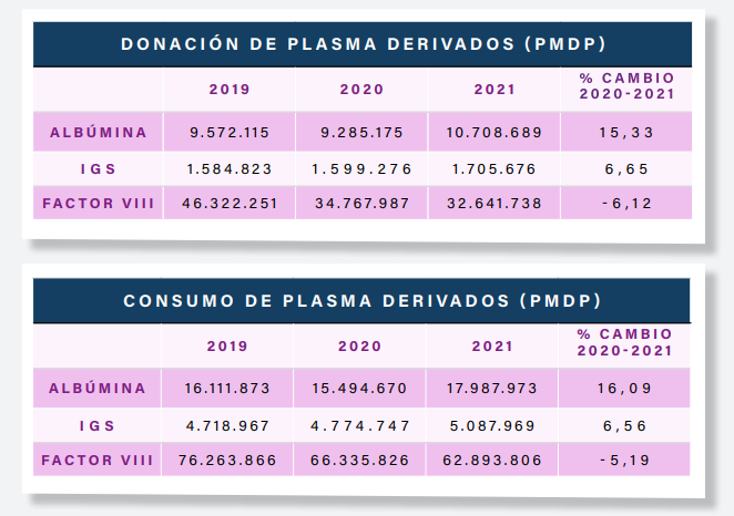La supuesta “vuelta a la normalidad” no se ha producido y el costo en salud de los y las pacientes es demasiado alto como para no abordar este déficit estructural. En la siguientes tablas recogemos los útimos datos publicados del Sistema Nacional de Transfusiones 1. La primera recoge la cantidad (en gramos) de derivados plasmáticos (productos medicinales obtenidos del plasma o PMDP) obtenidos por la indusria fraccionadora a par tir de las donaciones estatales.