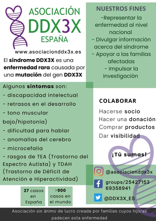 El síndrome DDX3X es una enfermedad rara descrita por primera vez en 2014. Está causada por una mutación, generalmente espontánea, en el gen DDX3X que puede resultar en una amplia variedad de síntomas que incluyen discapacidad intelectual, retraso en el desarrollo y en el crecimiento, hipotonía muscular, alteración del desarrollo de lenguaje, malformaciones cerebrales, microcefalia, rasgos del trastorno de espectro autista (TEA) y/o rasgos de trastorno de déficit de atención e hiperactividad (TDAH). Hasta la fecha actual sólo se han diagnosticado cerca de 800 casos a nivel mundial. En España hay constancia de solo 26 casos de síndrome DDX3X.