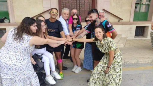 El presidente de D´Genes, Juan Carrión, junto a otros miembros de la directiva de la entidad y socios de la misma, acompañados por el alcalde de Totana, Juan Pagán, y las concejalas de Bienestar Social, Isabel García Merinos, y Deportes, Patricia Corbalán, desearon a los dos jóvenes éxito en este reto personal que van a emprender y que les llevará a recorrer durante un año aproximadamente unos 12.000 kilómetros según sus previsiones, pasando al menos por cinco países iberoamericanos.