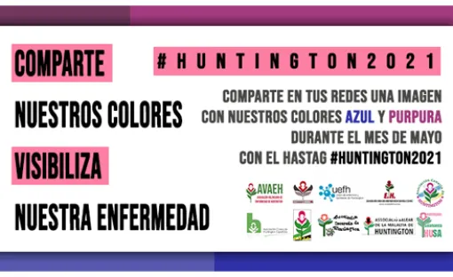 A lo largo del mes de mayo, podéis participar en nuestra campaña colgando en vuestras redes sociales y web, fotografías en las que compartís sus colores de representación, el AZUL y elPÚRPURA, Con el hashtag oficial de la campaña #huntington2021, pero también con otros como estos:"