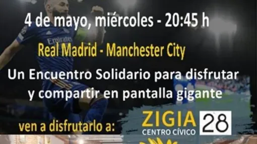 En la Fundación Mari Paz Jiménez Casado han preparado un encuentro solidario para el próximo 4 de mayo en el Centro Cívico Zigia en el que se retransmitirá el partido que enfrenta al Real Madrid y al Manchester City.