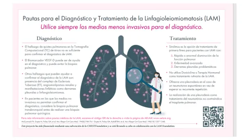 La linfangioleiomiomatosis (LAM) es una enfermedad pulmonar poco frecuente y de causa desconocida, que afecta a mujeres, por lo general, en edad fértil y que se caracteriza por un crecimiento anómalo de células musculares lisas atípicas (células LAM) a nivel pulmonar, formando quistes o bullas, afectando las vías aéreas, vasos linfáticos y sanguíneos, de modo que destruyen progresivamente el tejido pulmonar sano y éste va perdiendo su función. La Linfangioleiomiomatosis puede aparecer de forma esporádica o asociada a la presencia de otra enfermedad rara, la Esclerosis Tuberosa. Puede presentar complicaciones como neumotórax, quilotórax y hemoptisis, y suele evolucionar en insuficiencia respiratoria. El diagnóstico de LAM con frecuencia se retrasa, ya que en algunos casos, se diagnostica inicialmente de forma equivocada ya sea como asma, enfisema o enfermedad pulmonar obstructiva crónica (EPOC), lo cual es comprensible dada su rareza.