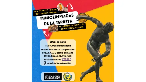 Nota de prensa. Fuente: Conquistando Escalones. | En algo más de dos semanas llegarán las Miniolimpiadas de la terreta con la que, desde la Asociación Conquistando Escalones, buscan promocionar dos de los productos más típicos de nuestra zona. Un evento que se celebrará el 24 de marzo con las primeras ediciones de dos campeonatos mundiales: el de exprimir naranjas y el de comer pilotes de frare pero que también estará abierto a la ciudadanía en general.