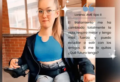 A Lorena, que tiene 18 años y AME tipo II, el tratamiento le ha cambiado totalmente la vida, y comenta: “Ahora tengo muchísima resistencia en mi día a día, más capacidad a nivel respiratorio, también mucha más fuerza en la espalda y el cuello, lo que me permite estudiar, salir con amigos... Sin el tratamiento, no sé qué hubiera sido de mí, estaba muy mal.”