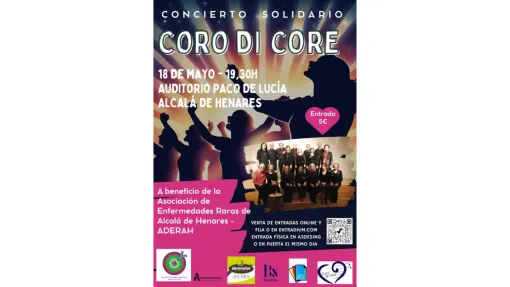 La Asociación de Enfermedades Raras de Alcalá de Henares (ADERAH),presenta el nuevo proyecto de colaboración con el singular CORO DI CORE que se va a llevar a cabo con motivo de la noche en blanco de Alcalá de Henares para apoyar y mejorar la calidad de vida de las personas con enfermedades raras ,Concierto benéfico de CORO DI CORE en un entorno a favor de las enfermedades raras el próximo 18 de mayo a las 19:30 h en el Auditorio Paco de Lucia, el primer festival de música coral totalmente inclusivo y accesible en la Noche en Blanco , el cual, se establece como una forma alternativa de ocio benéfico en Alcalá de Henares dirigido a todos los públicos en esta noche tan mágica.