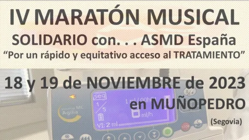 Un año más, la familia Barreno Rubio, papás de 2 niños afectados por ASMD, celebra en la localidad de Muñopedro (Segovia) el Maratón Musical Solidario a favor de la Asociación ASMD España. Tendrá lugar los días 18 y 19 de noviembre bajo el lema "Por un rápido y equitativo acceso al TRATAMIENTO".