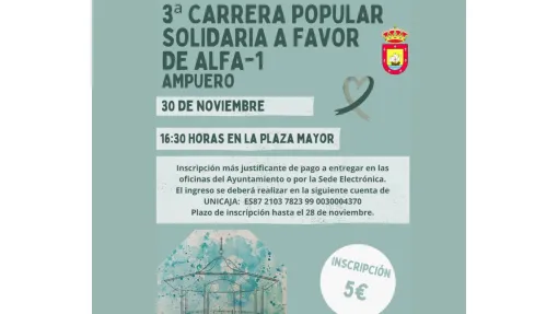 El Ayuntamiento cántabro de Ampuero organiza la tercera edición de la Carrera Popular Solidaria a Favor de Alfa-1, un evento deportivo y benéfico que se celebrará el próximo 30 de noviembre a las 16:30 horas en la Plaza Mayor del municipio. Esta actividad forma parte de las iniciativas solidarias destinadas a apoyar a la comunidad Alfa-1 España, que conmemora 25 años de esfuerzo y compromiso con las personas que padecen esta condición genética poco frecuente.