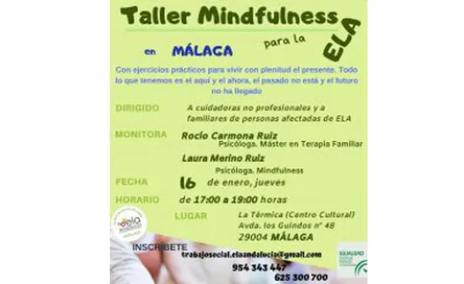 Fuente: ELA AndalucíaLa asociación ELA Andalucía organiza un taller Mindfulness para el jueves 16 de enero en Málaga, en la Térmica (Centro Cultural) Avda de los Guindos nº 48 de Málaga, de 17:00 a 19:00 horas, monitorizado por las psicólogas, Rocío Carmona y Laura Merino</p><p>