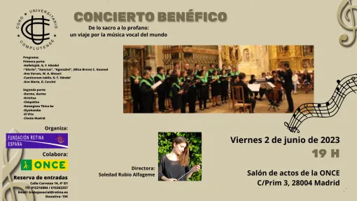 La Asociación Retina Madrid ha anunciado la organización de un concierto benéfico el próximo 2 de junio en el Salón de Actos de la ONCE, con el objetivo de recaudar fondos para apoyar la investigación y el tratamiento de las enfermedades de la retina. El concierto benéfico realizará un viaje por la música vocal del mundo y contará con la participación de inigualables artistas, miembros del Coro Universitario Complutense, que interpretarán algunas de las obras más representativas del repertorio vocal sacro europeo y canciones del mundo de carácter popular