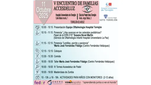 El próximo 11 de octubre tendrá lugar en Madrid el V Encuentro de familias ACCESDELUZ, será en Torrejón de Ardoz, sede de nuestra asociación, contaremos con varias ponencias en el Hospital de Torrejón que nos cede su salón de actos, comida en el Club de pádel Soto-Torrejón, actividades para niños y paralelamente por la tarde torneo de pádel. Os presentamos el programa:
