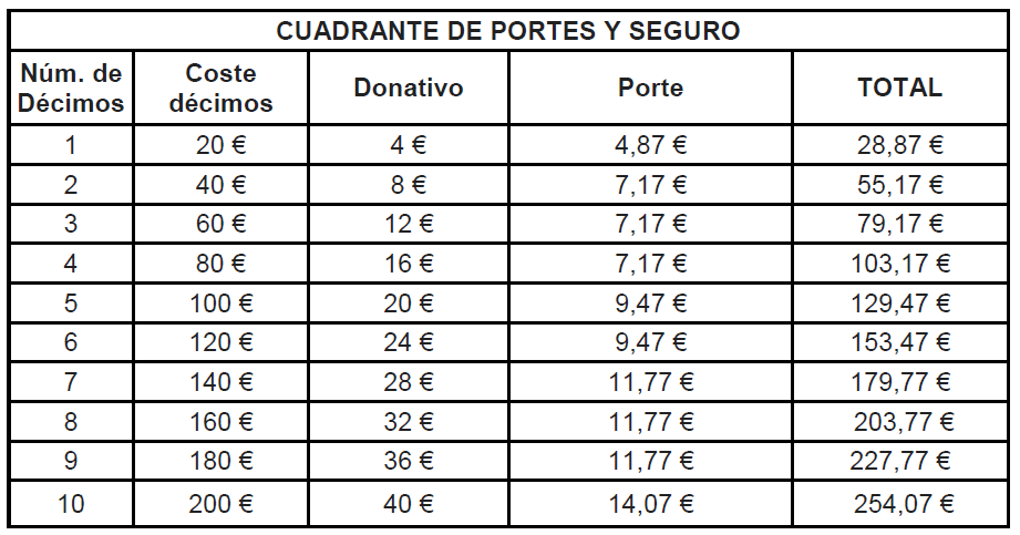 3. Si vives fuera de las ciudades de Sevilla o Córdoba, debes añadir los costes de envío y seguro para recibir la lotería en la dirección que nos indiques. En este caso, consulta el cuadrante de abajo para saber la cantidad a sumar en función del número de décimos que quieras comprar. En nuestro ejemplo, el precio de portes y seguro sería de 9,47€.