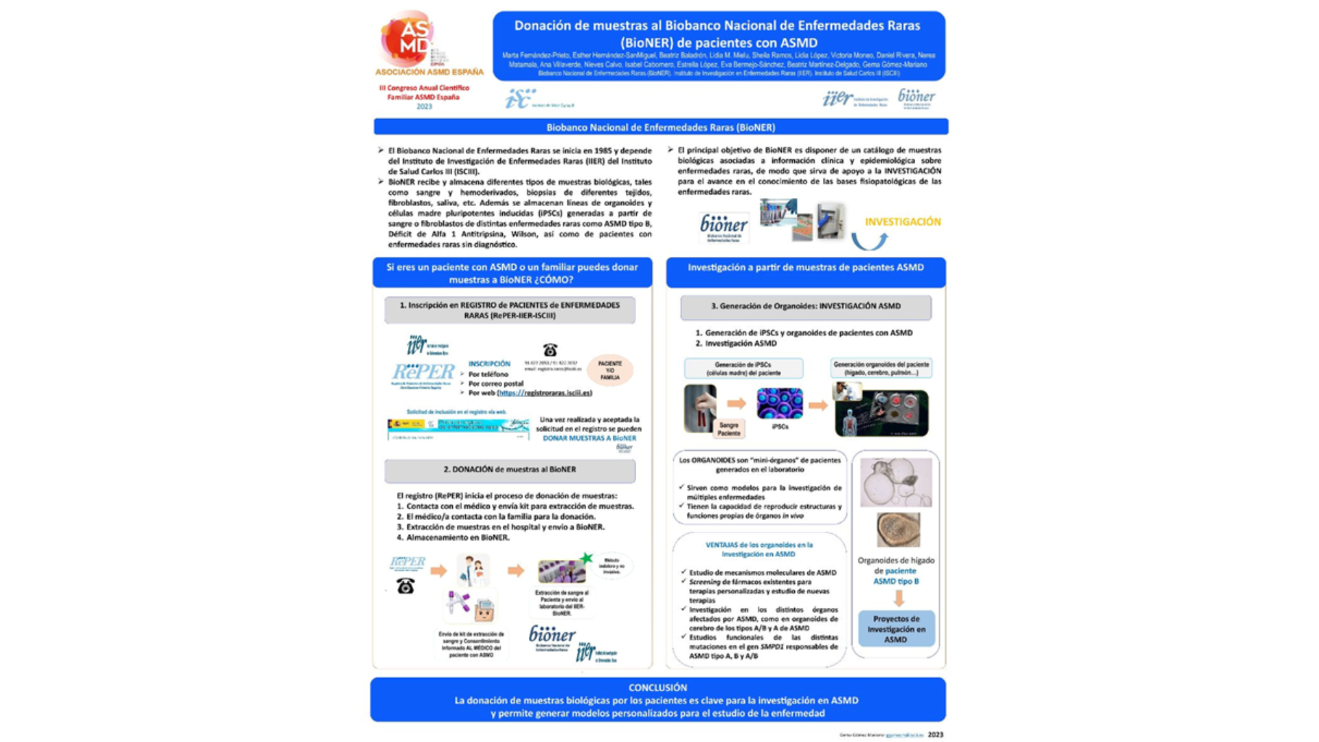 Compartimos con vosotros el poster que se presentó en III Congreso Anual Científico Familiar ASMD España sobre la donación de muestras al Biobanco Nacional de Enfermedades Raras.