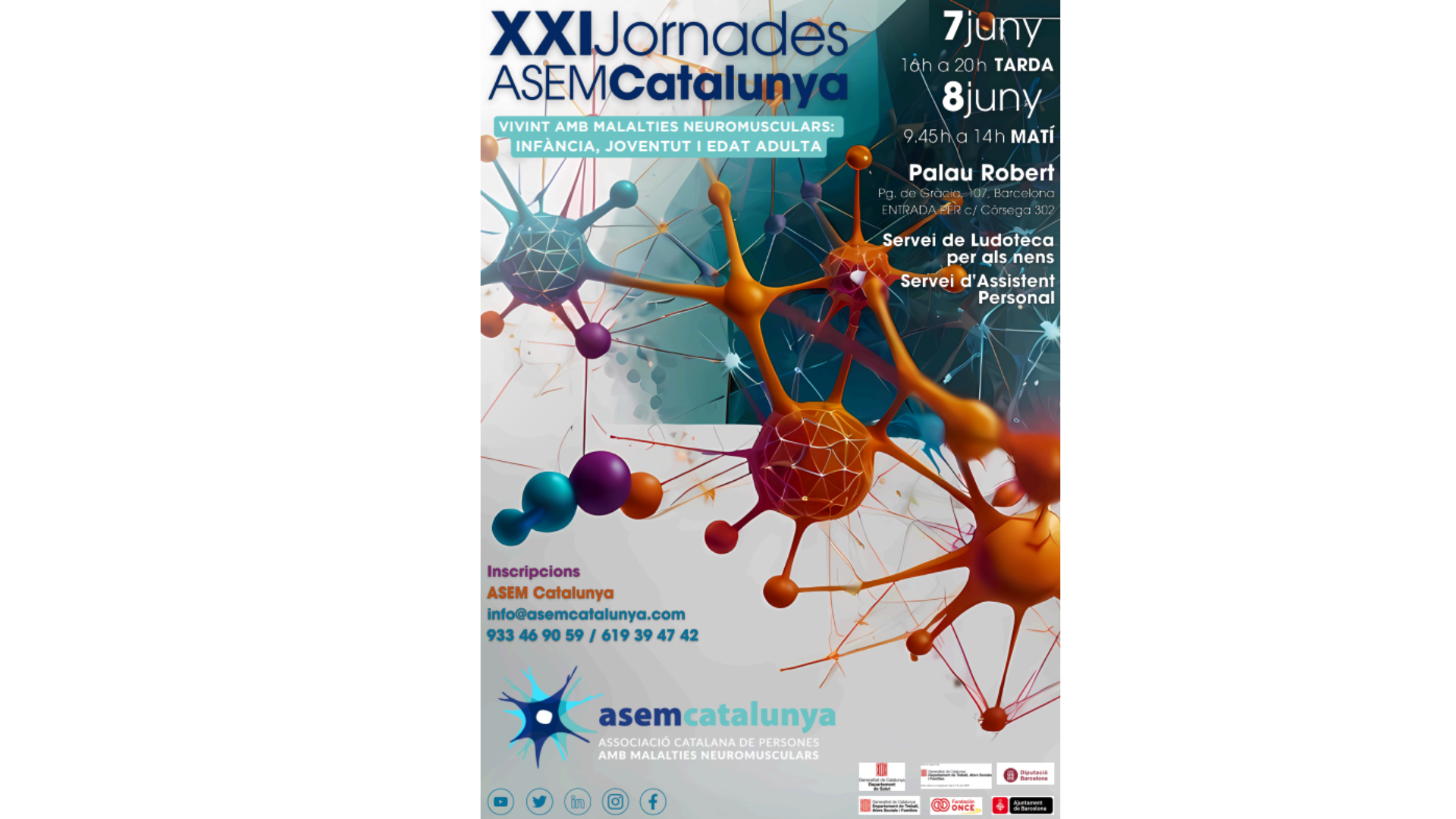 ASEM Catalunya, un año más, celebra sus Jornadas, este año tituladas: "VIVIENDO CON ENFERMEDADES NEUROMUSCULARES: INFANCIA, JUVENTUD Y EDAD ADULTA".Inscríbete aquíSe celebrarán el próximo 7 y 8 de...