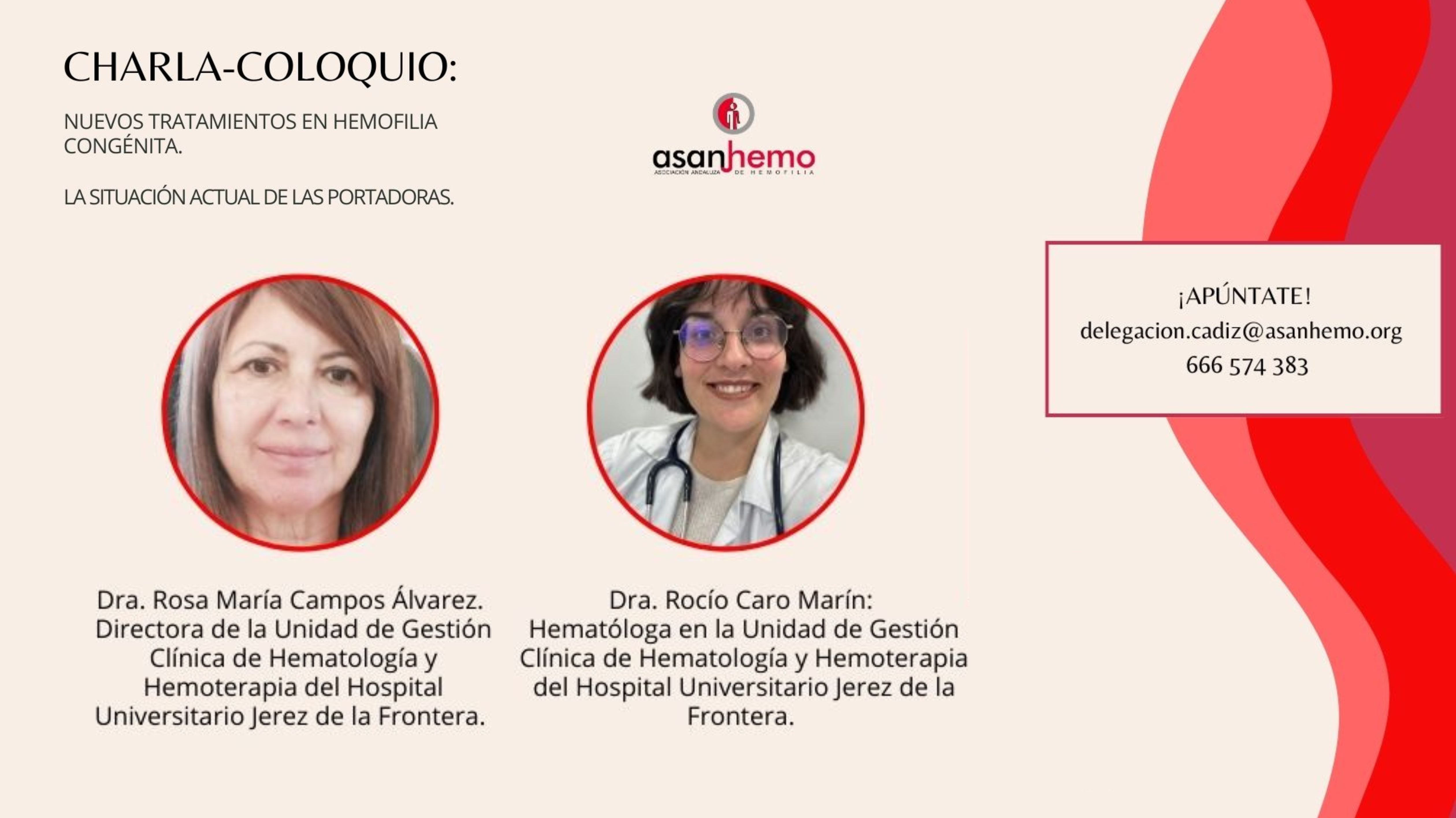 Desde la Delegación de la Asociación Andaluza de Hemofilia en Cádiz celebran una Charla-coloquio sobre 'Nuevos tratamientos en hemofilia congénita y la situación de las portadoras'.