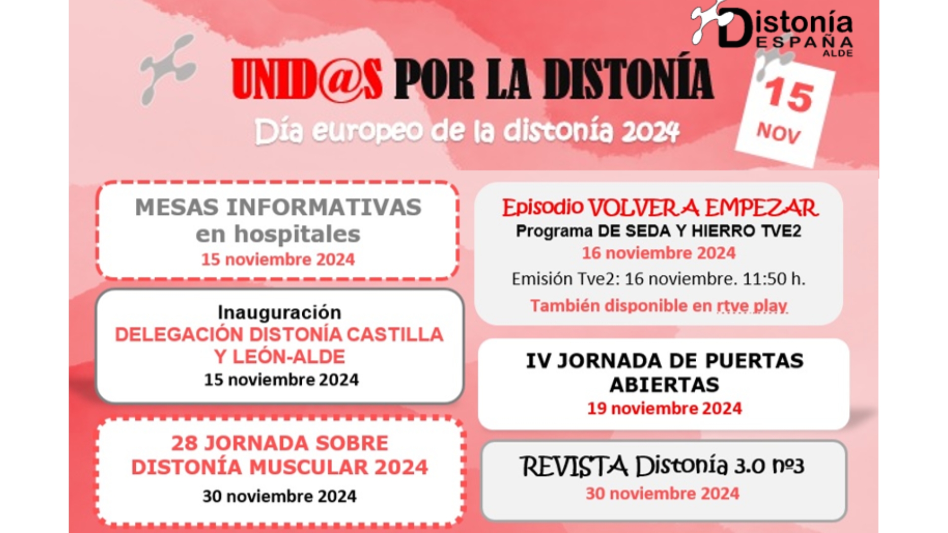 Distonía España–ALDE, bajo el slogan Unid@s por la Distonía, realizará varias actividades de divulgación científica y sensibilización social para visibilizar la distonía y la labor de la asociación...