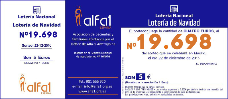 Fuente: ALFA-1 | Un año más, en la Asociación Alfa-1 de España volvemos a repartir suerte. La Asociación Alfa 1 de España ha reservado décimos del número 19.698 para el sorteo extraordinario de...