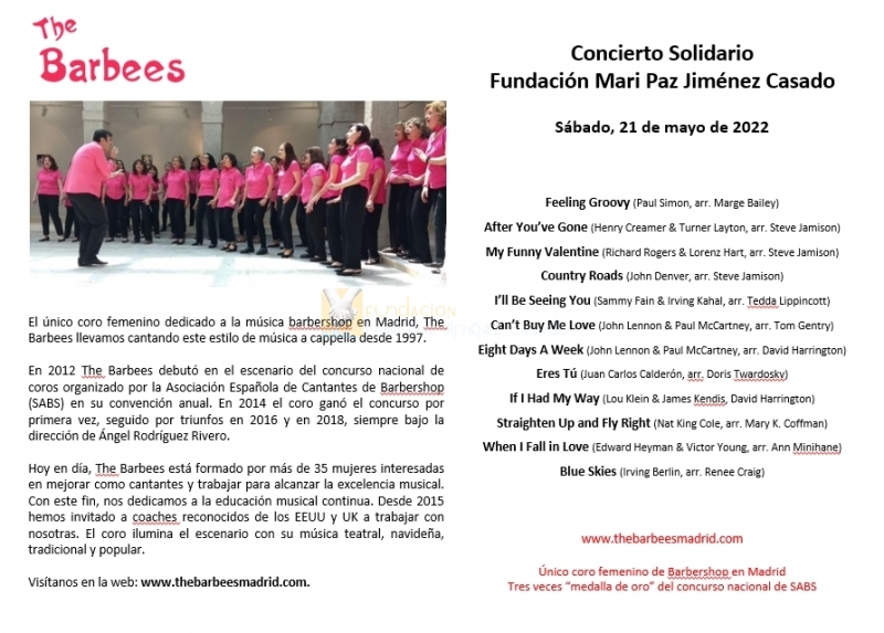 Fuente Fundación Mari Paz Jiménez | Nos complace mucho anunciaros un nuevo Concierto Solidario protagonizado por The Barbees. Este grupo es el único coro femenino dedicado a la música barbershop...