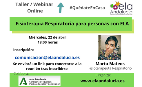 Fuente: ELA Andalucía. Bajo el título “Fisioterapia Respiratoria para Personas con ELA”, la Asociación ELA Andalucía organiza un taller online previsto para el próximo miércoles 22 de abril, a las 18...