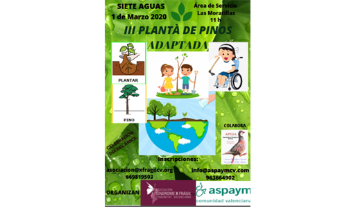 Fuente: ASPAYM y XFrágil Este domingo 1 de marzo en Siete Aguas (Valencia) se realizará una plantación de pinos organizada por X Frágil Comunidad Valenciana en colaboración con ASPAYM Comunidad...