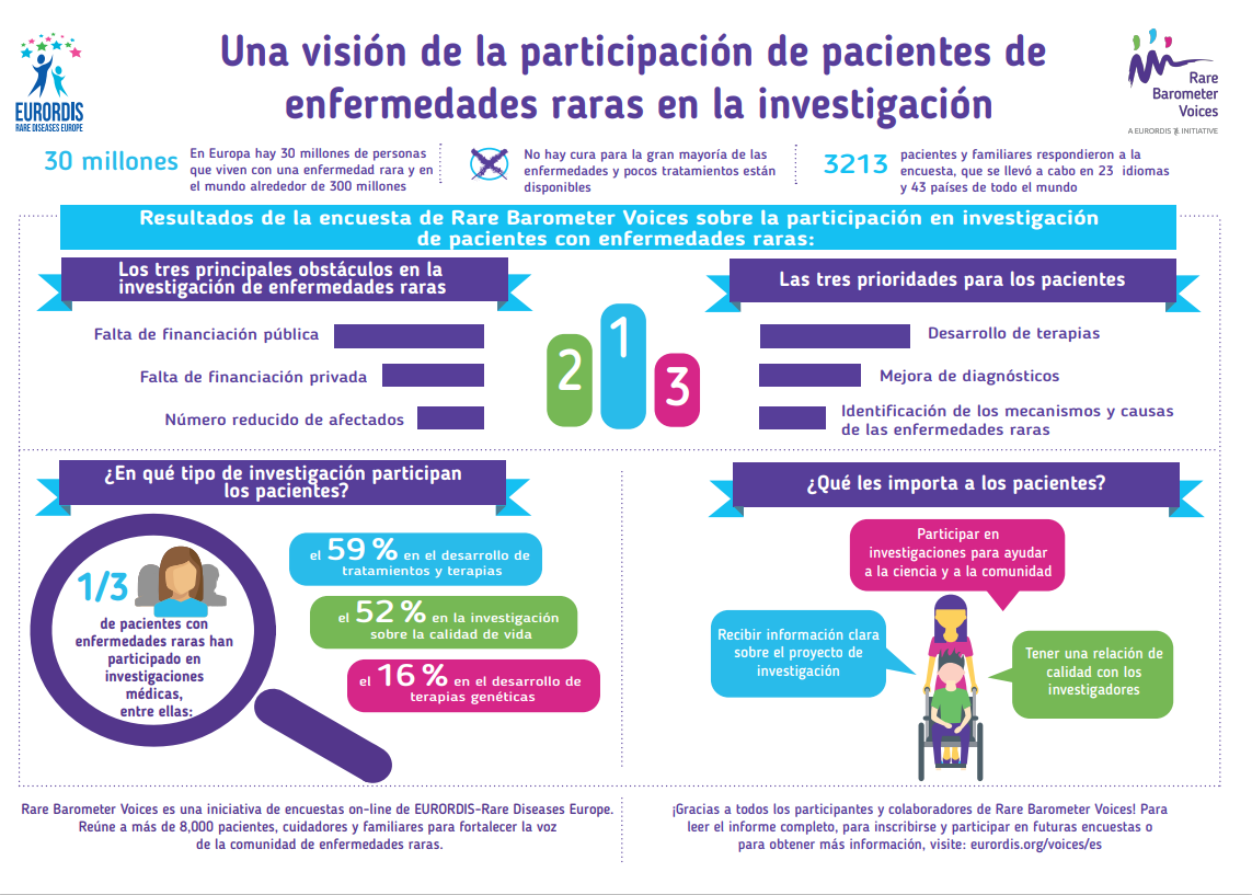 Para garantizar que se incluyera la perspectiva directa del paciente en la elaboración de las recomendaciones finales, el estudio ha tenido en cuenta la experiencia, las necesidades y la opinión de miles de personas que viven con una enfermedad rara y que tienen han aportado su opinión durante la última década a través de los programas de encuestas EurordisCare y Rare Barometer. La encuesta Rare 2030 recogió las necesidades y prioridades de 3 998 pacientes, cuidadores y representantes de pacientes.