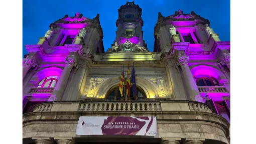 Con motivo del Día Europeo del Síndrome X Frágil, que tuvo lugar el pasado 10 de octubre, tanto la fachada del Ayuntamiento de Valencia como la Porta del Mar se vistieron de rosa, iluminando sus fachadas de este color.